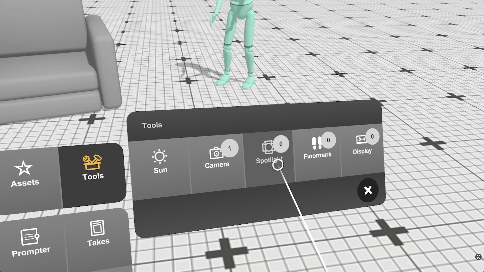 To place a Light into your Animotive scene, **toggle on the**[ **Menu**](https://animotive.gitbook.io/animotive-documentation/learning-animotive/menus) then **select the Tools Menu in the toolbar and press the right trigger button.** After selecting Tools, **select the lighting icon and press the right trigger** to spawn a Light in the scene.
