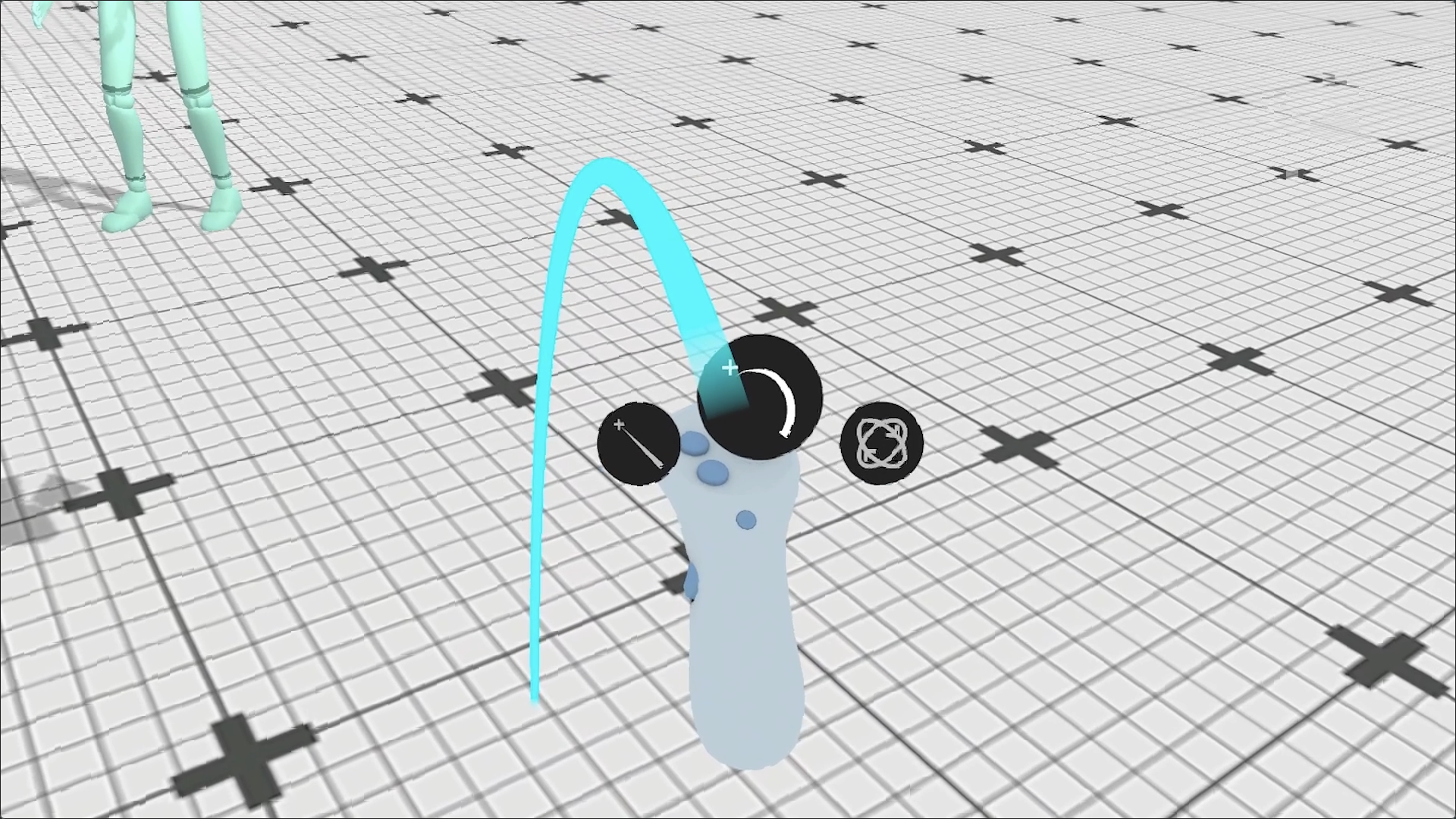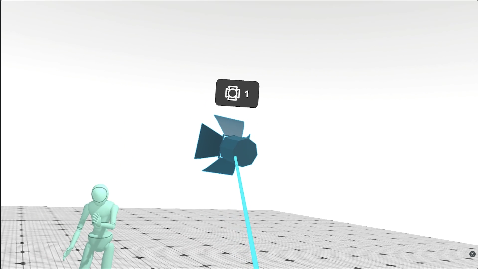 The second mode is called **Parabola Mode**. You can switch to this by **flicking the right Thumbstick left or right**. In Parabola Mode, the Light will become anchored to the floor, and you can move the Light through the space by **moving your controller and holding the Grip button**. You can rotate it as well, by **twisting your controller left or right**. To place a Light, make sure your laser is blue, and **release the Grip button**.